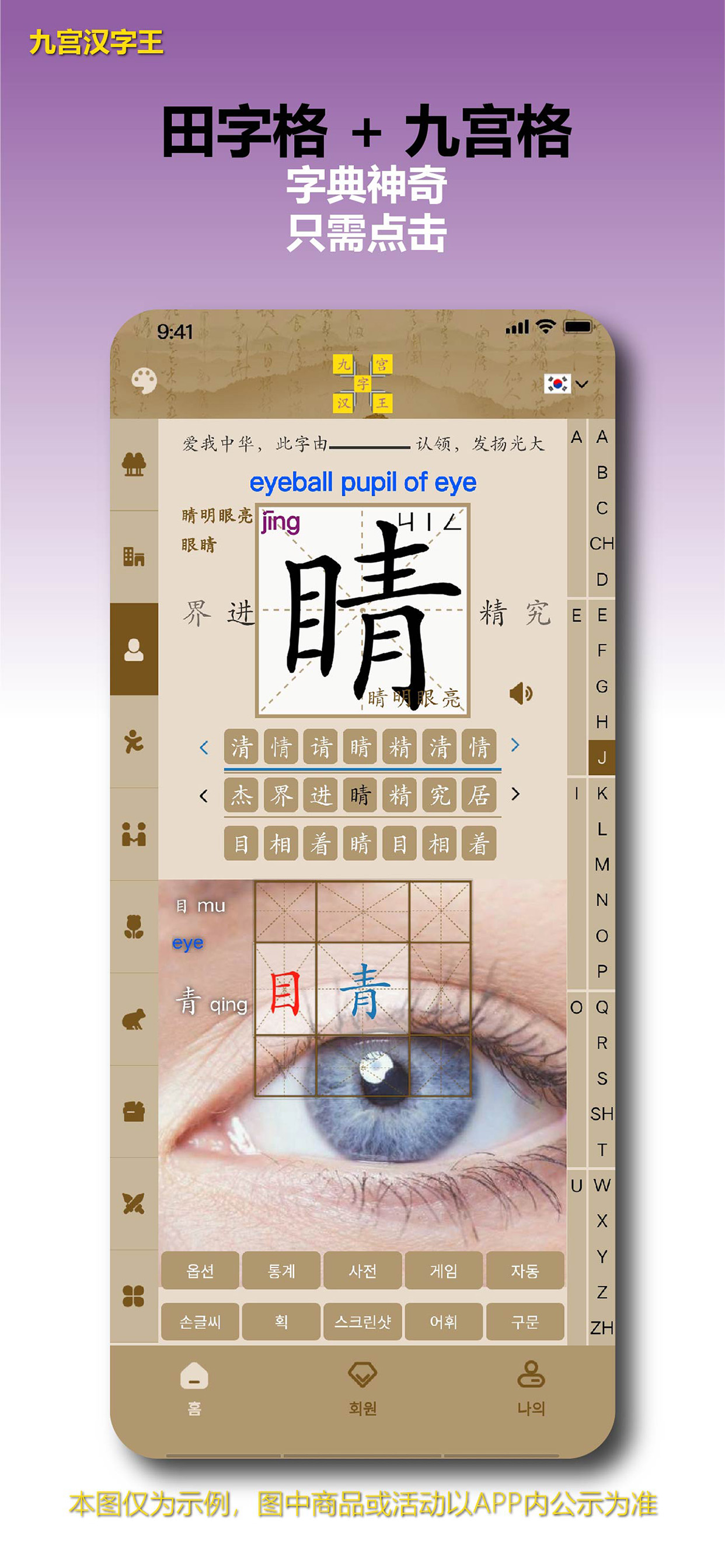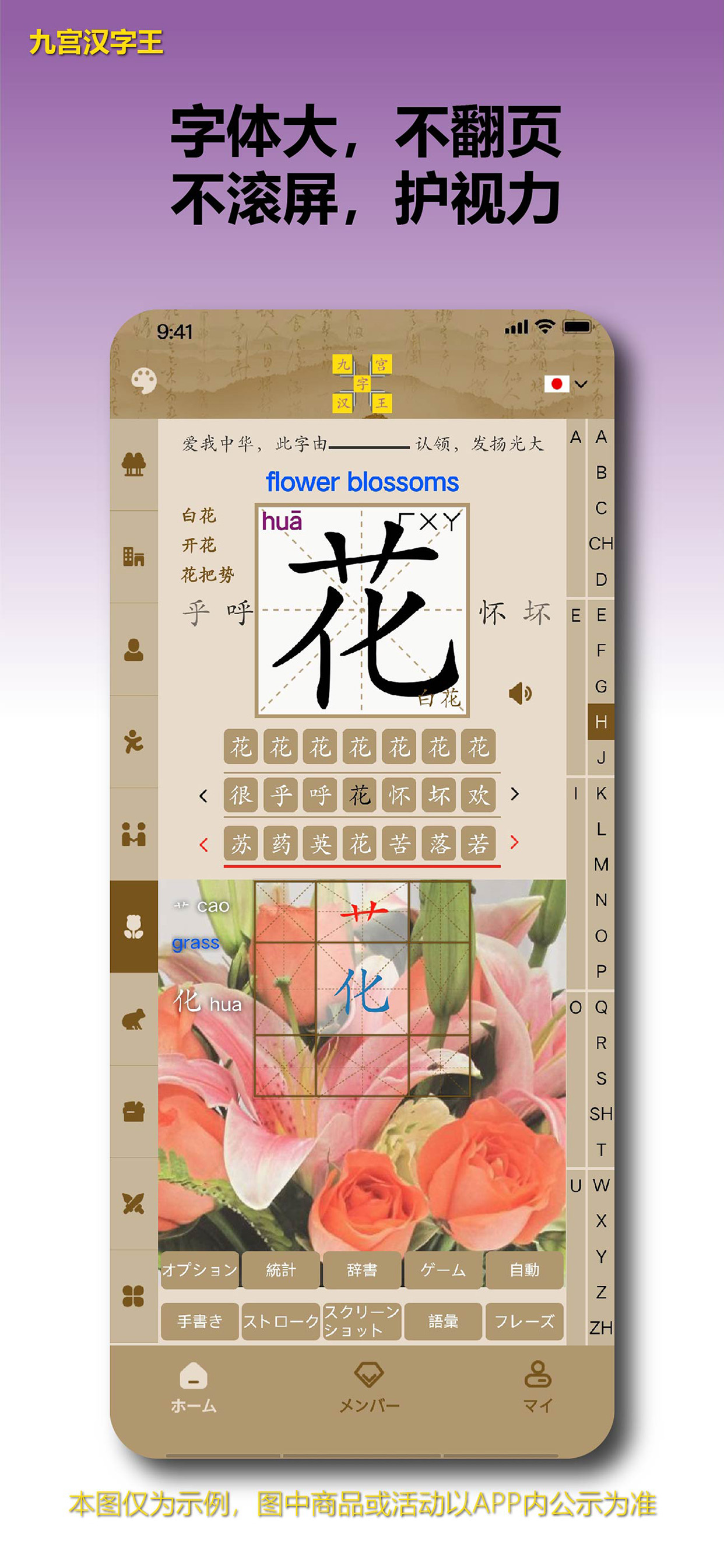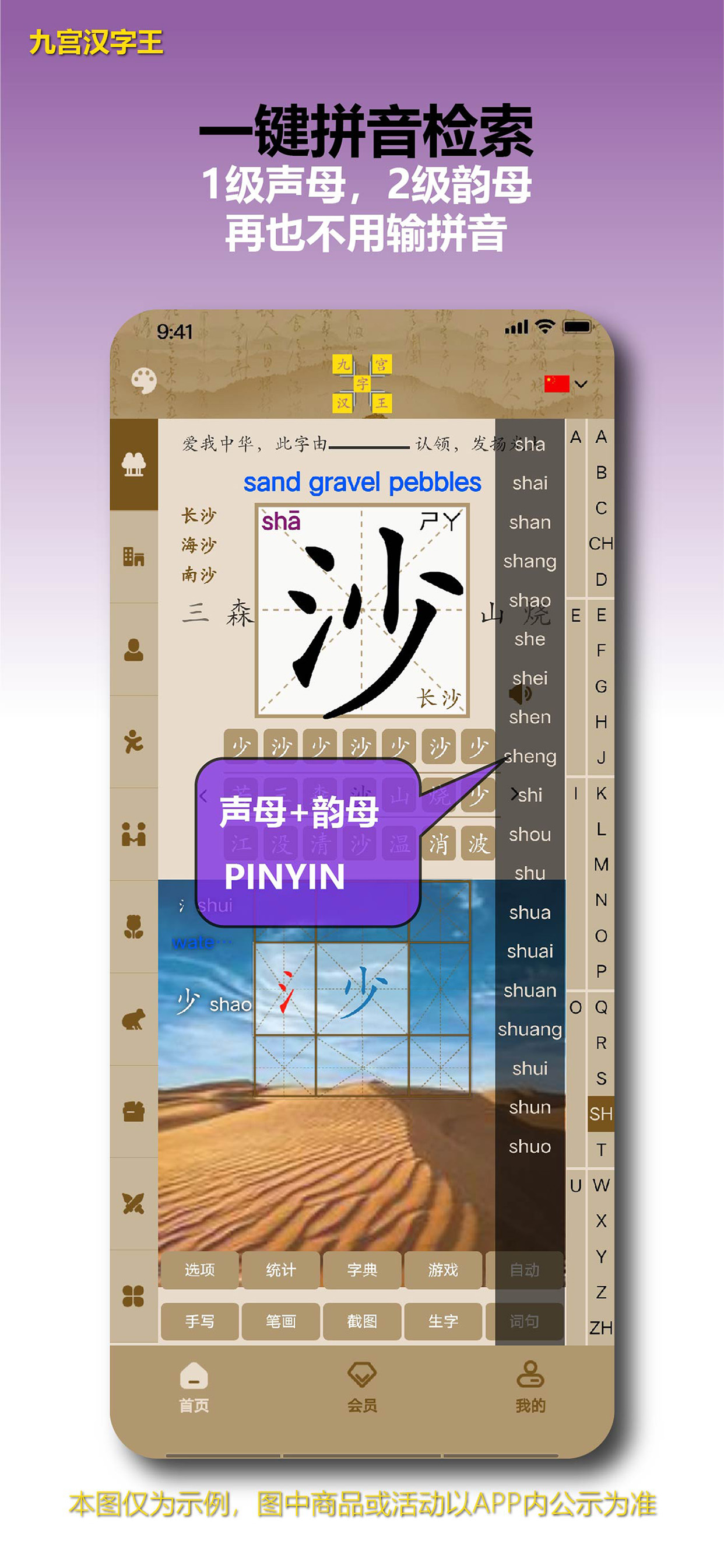 每个汉字的基本信息在同一页上显示,无需翻页、上下左右滚屏,可 以有效保护使用者的视力。 全触屏操作, 纵览拼音、组词、成语、例 句、英文、图片、属性。 一键链接外部汉字网页、自动播放学习。